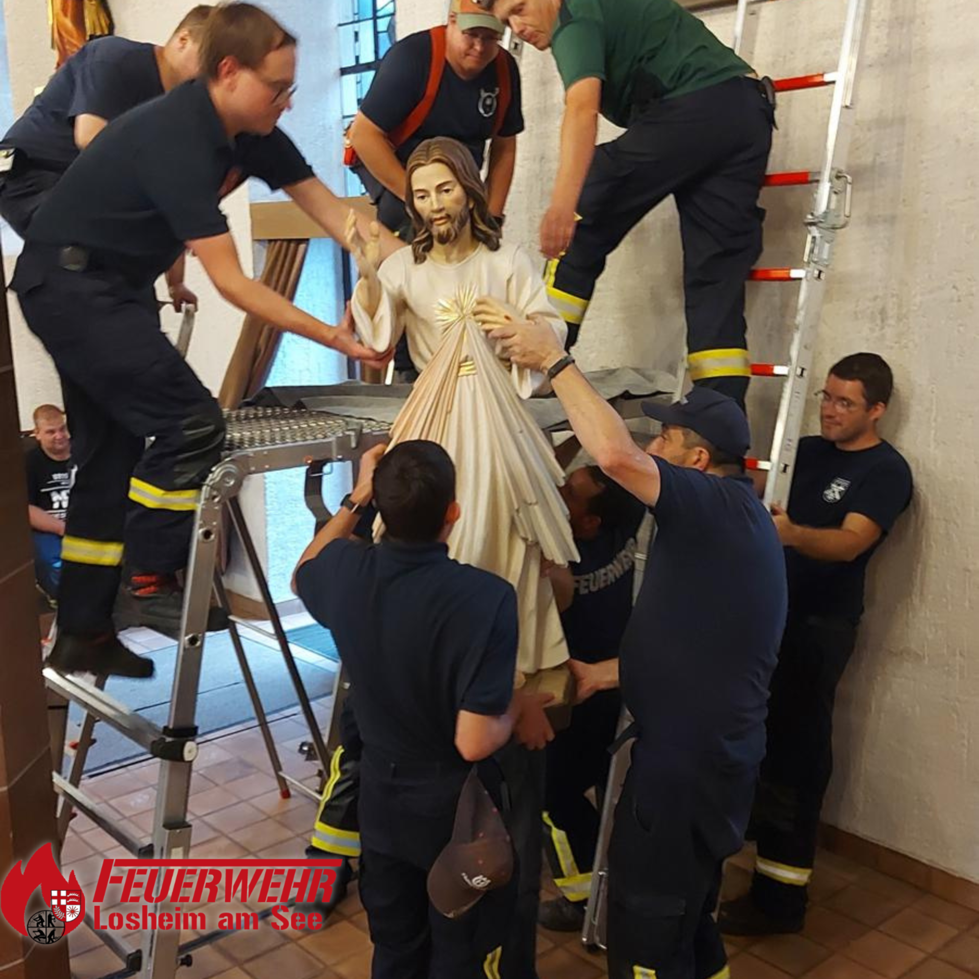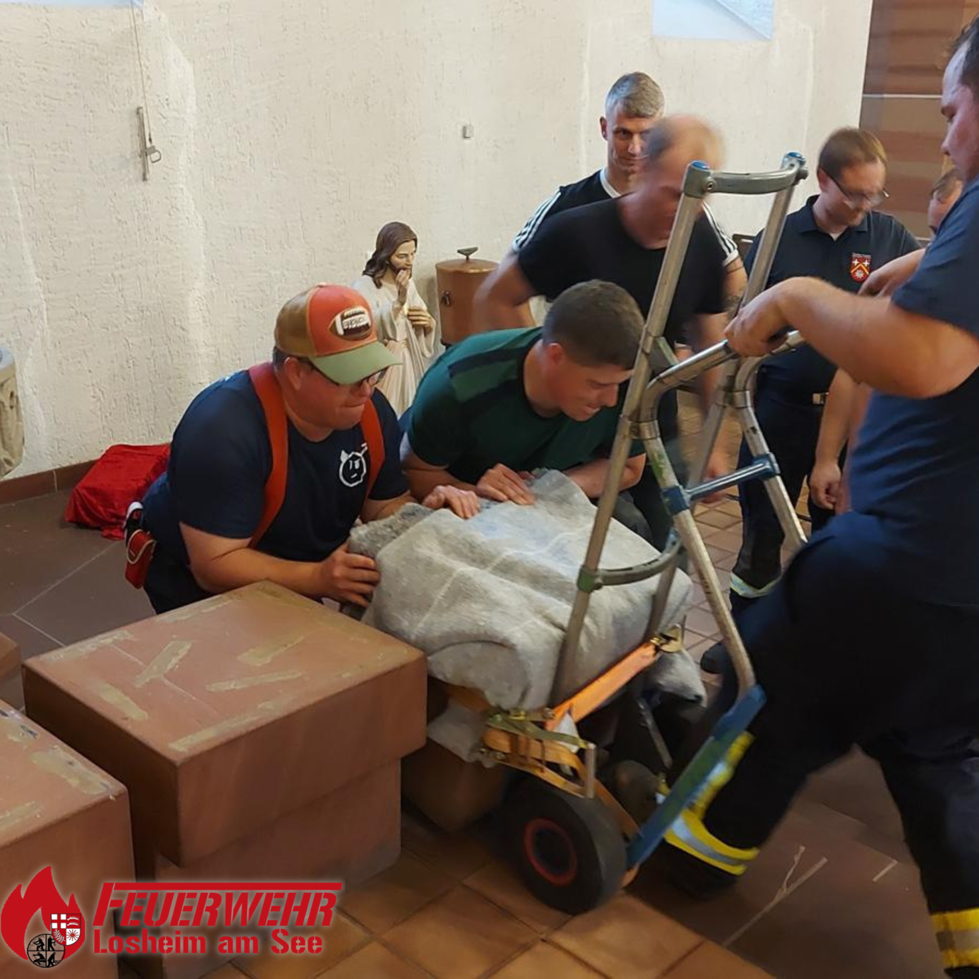 Selbstverständlich helfen wir auch gerne, wenn im Ort helfende Hände benötigt werden. So kam vor Kurzem eine nicht alltägliche Anfrage von Pfarrer Christian Kossmann an unseren Gemeindewehrführer Andreas Brausch: In der Kirche „St. Peter und Paul” sollte eine Jesusfigur aufgehängt und mehrere schwere Sitzblöcke versetzt werden. Nein, dieses Mal war es nicht der heilige St. Florian.