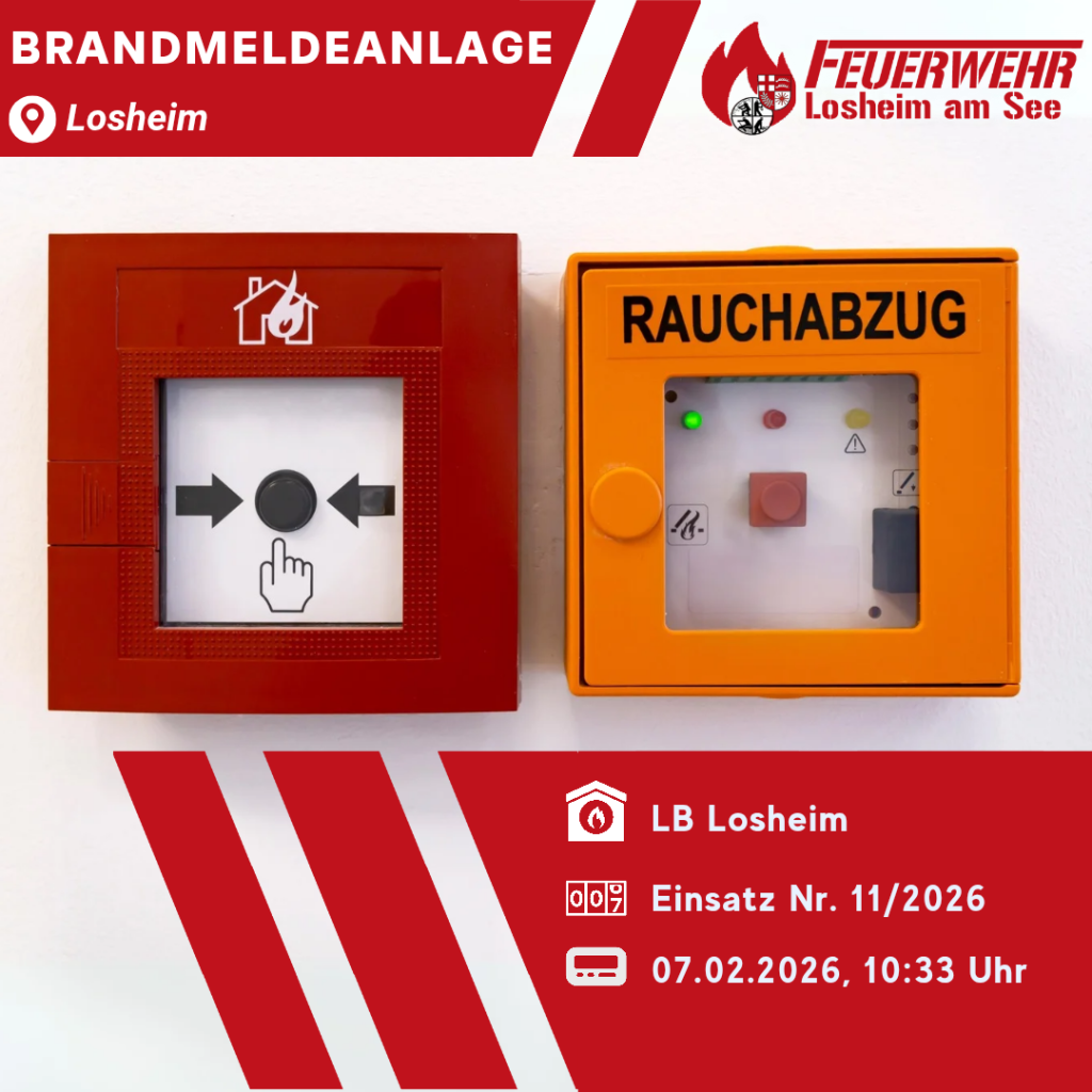 Auslösung Brandmeldeanlage Datum: 7. Februar 2026 um 10:33 UhrEinsatzart: BMAEinsatzort: LosheimEinheiten und Fahrzeuge: LB 1 – Losheim: ELW 1 , TLF 24/50 , DLK 23/12 , HLF 20/20 KDOW Weitere Kräfte: RettungsdienstEinsatzbericht: Auslösung BMA in Seniorenheim. Überprüfung ergibt Täuschungsalarm durch Wasserdampf.