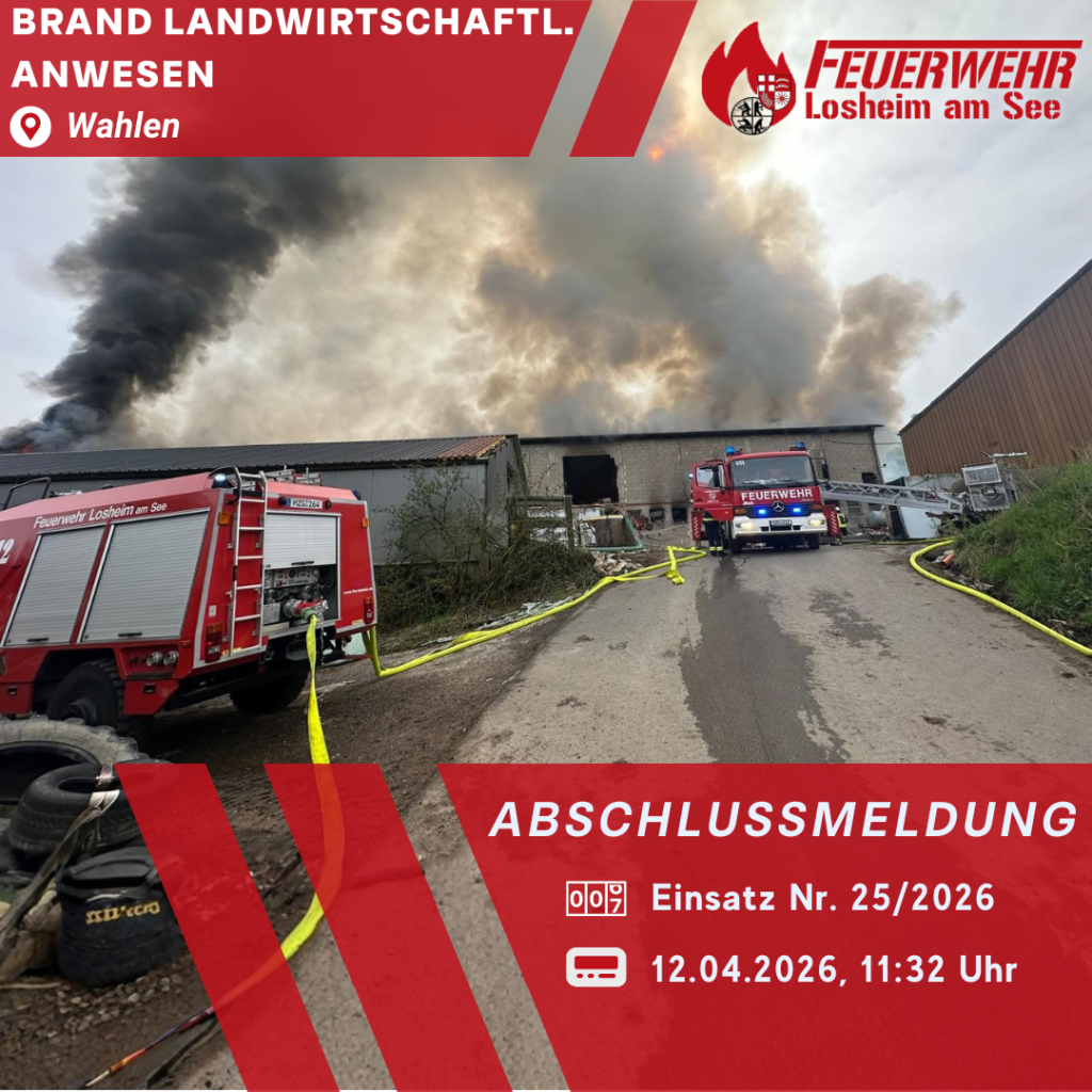 Zu einem Brand in einem landwirtschaftlichen Anwesen kam es am 12.04.2026 gegen 11:30 Uhr. Bei Eintreffen der ersten Einsatzkräfte stand ein Wirtschaftsgebäude auf dem Hof in Wahlen bereits im Vollbrand. In dem Gebäude waren größere Mengen Strohballen und Holz-Hackschnitzel gelagert. Menschen oder Tiere kamen glücklicherweise nicht zu Schaden.