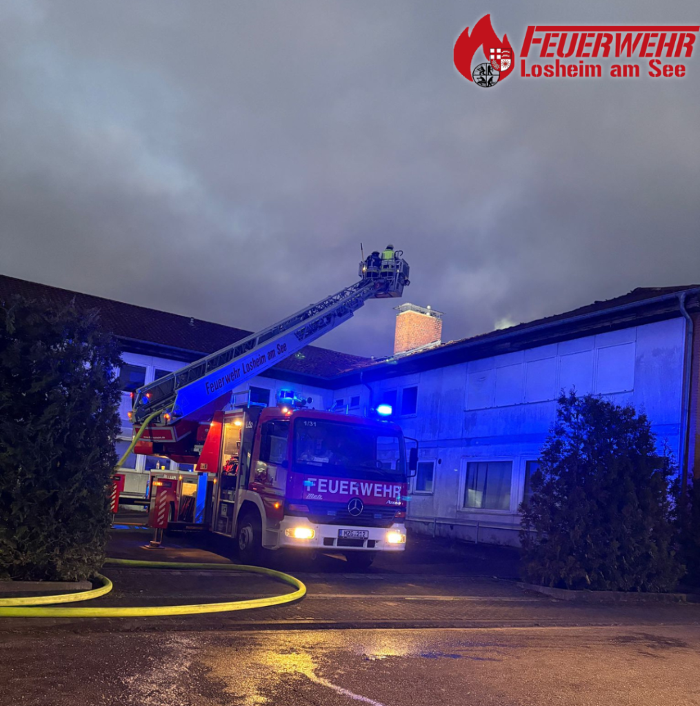 Meldung über Lagerhallenbrand mit Ausbreitungsgefahr. Vor Ort ausgedehnter Dachstuhlbrand in leerstehendem Bürogebäude mit teilweisem Übergriff auf 1. OG. Brandbekämpfung über zwei Drehleitern sowie unter Atemschutz im Innenangriff. Brand gegen 07 Uhr unter Kontrolle. Umfangreiche Nachlöscharbeiten, die sich bis in den späten Vormittag erstrecken und Nachforderung weiterer Löschbezirke mit Atemschutzgeräteträgern erfordern.