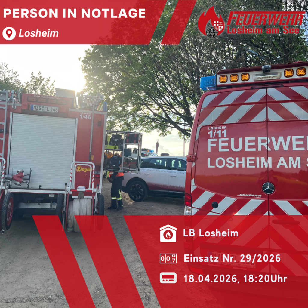 Person in Notlage Datum: 18. April 2026 um 18:20 UhrEinsatzart: Technische HilfeleistungEinsatzort: LosheimEinheiten und Fahrzeuge: LB 1 – Losheim: KDOW , ELW 1 , HLF 20/20 , GW-L2 Einsatzbericht: Gleitschirmflieger in Baum abgestürzt, Person gerettet und an Rettungsdienst übergeben
