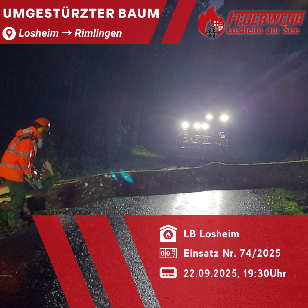 Baum mittels Kettensäge und mithilfe eines Teleskopladers beseitigt und Fahrbahn gereinigt.