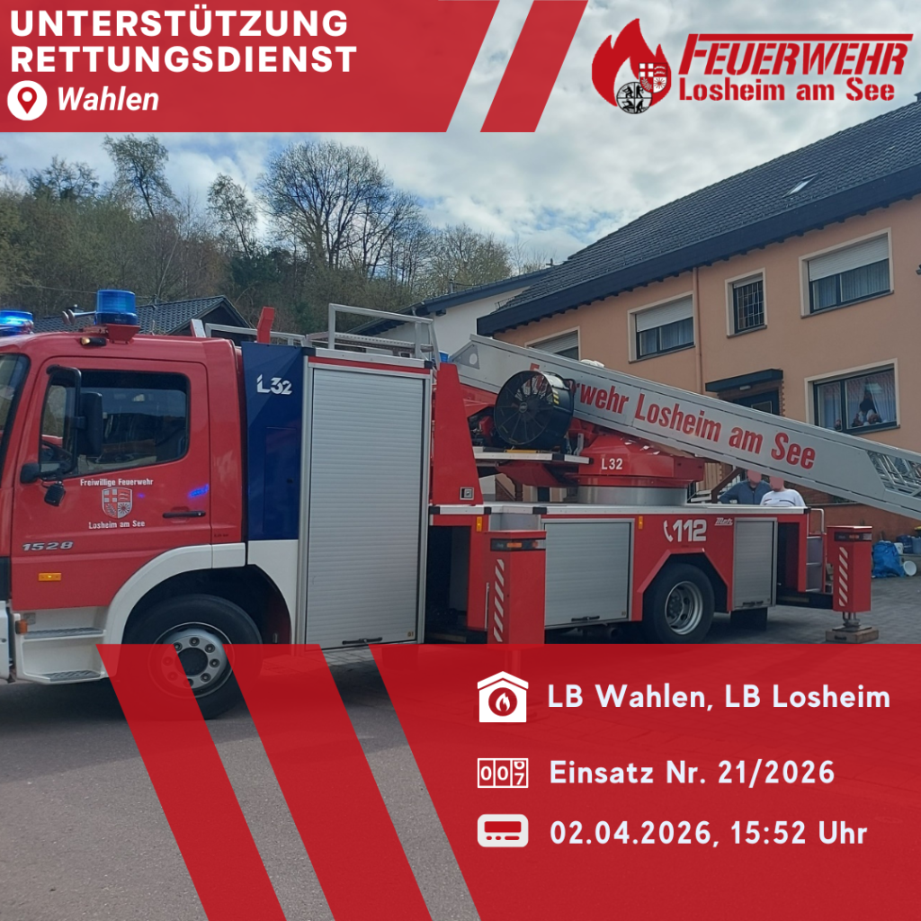 Unterstützung Rettungsdienst Datum: 3. April 2026 um 9:12 UhrEinsatzart: Unterstützung RettungsdienstEinsatzort: WahlenEinheiten und Fahrzeuge: LB 1 – Losheim: DLK 23/12 , GW-L2 LB 2 – Wahlen: LF 16 , LF-KatS KDOW Weitere Kräfte: RettungsdienstEinsatzbericht: Person über Drehleiter gerettet und an Rettungsdienst übergeben.