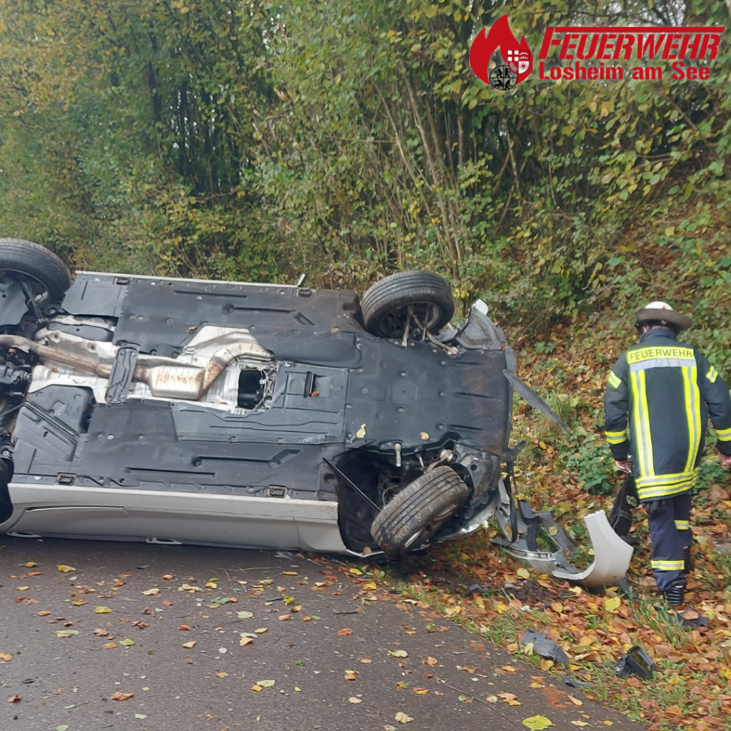 PKW nach Unfall seitlich auf Dach liegen geblieben, eine Person befreit und an Rettungsdienst übergeben, PKW gesichert und Einsatzstelle an Polizei übergeben.
