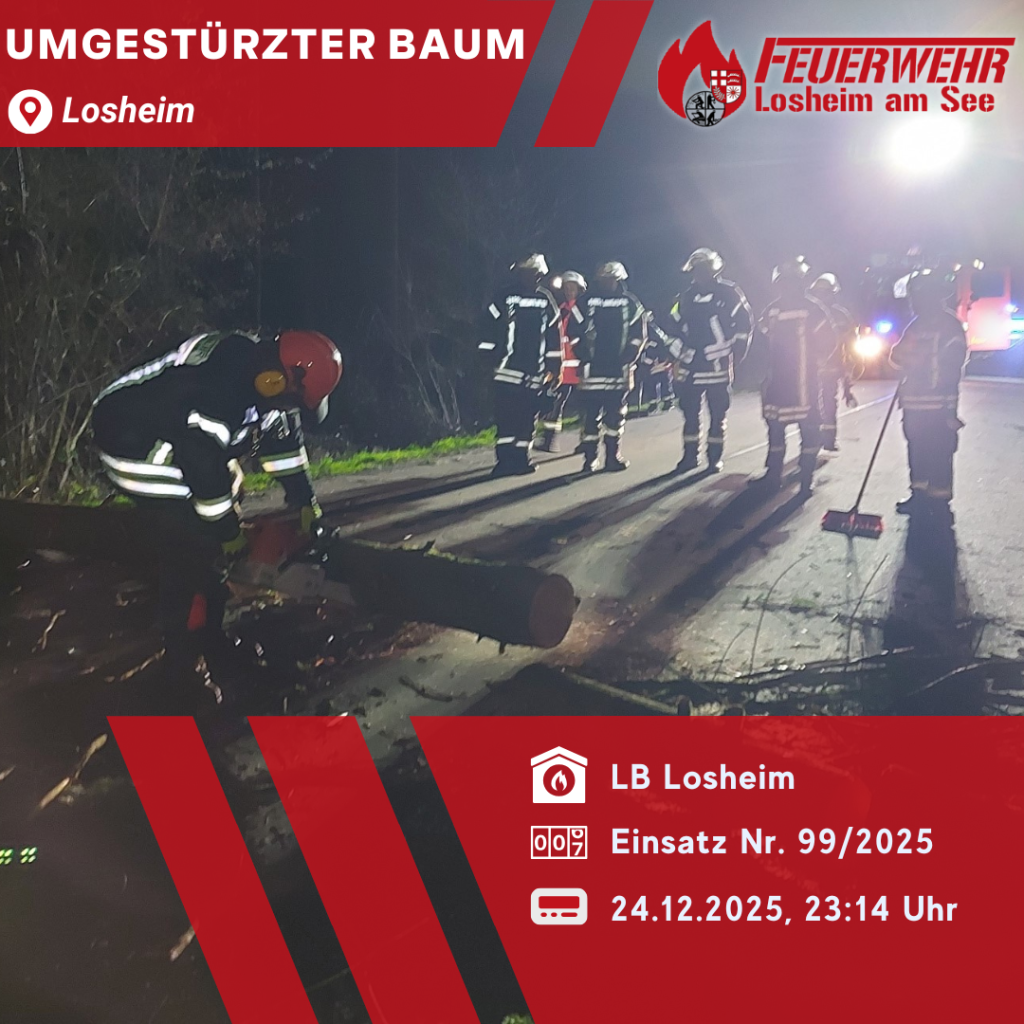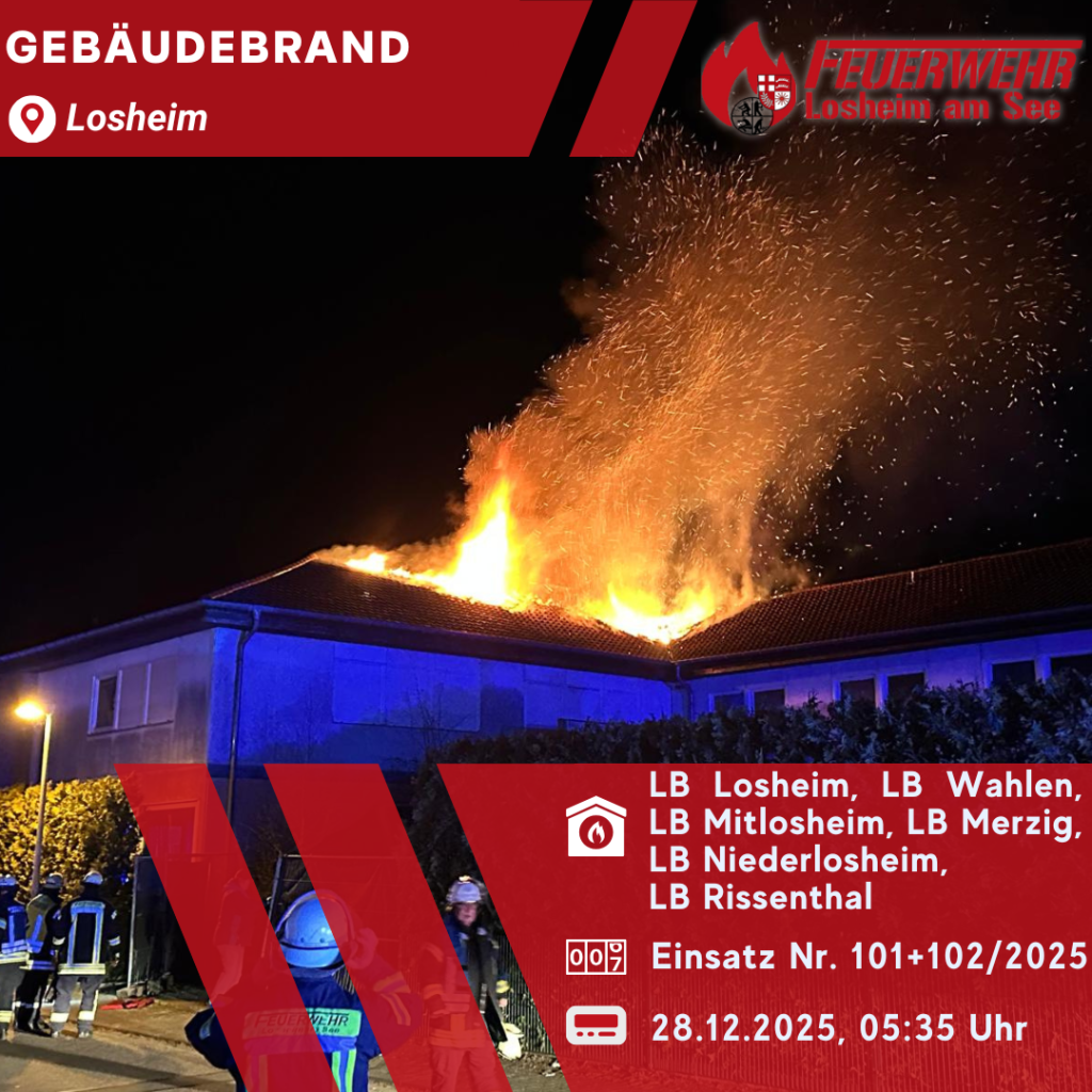 Erneute Brandmeldung im Einsatzobjekt vom 28.12.2025. Vor Ort Feststellung Dachstuhlbrand mit Nachforderung weiterer Löschbezirke sowie zweiter Drehleiter und Gerätewagen-Atemschutz. Brand über Drehleiter und unter Atemschutz im Innenangriff bekämpft. Baufachberater des THW zur Beurteilung der Gebäudestatik hinzugezogen. Bauhof wegen Straßenglätte zum Abstreuen verständigt. Eine Einsatzkraft wurde im Innenangriff durch herabstürzende Trümmer verletzt. Nach Erstversorgung und ambulanter […]