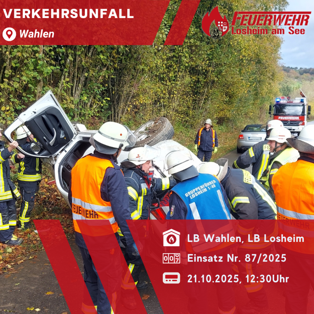 PKW nach Unfall seitlich auf Dach liegen geblieben, eine Person befreit und an Rettungsdienst übergeben, PKW gesichert und Einsatzstelle an Polizei übergeben.